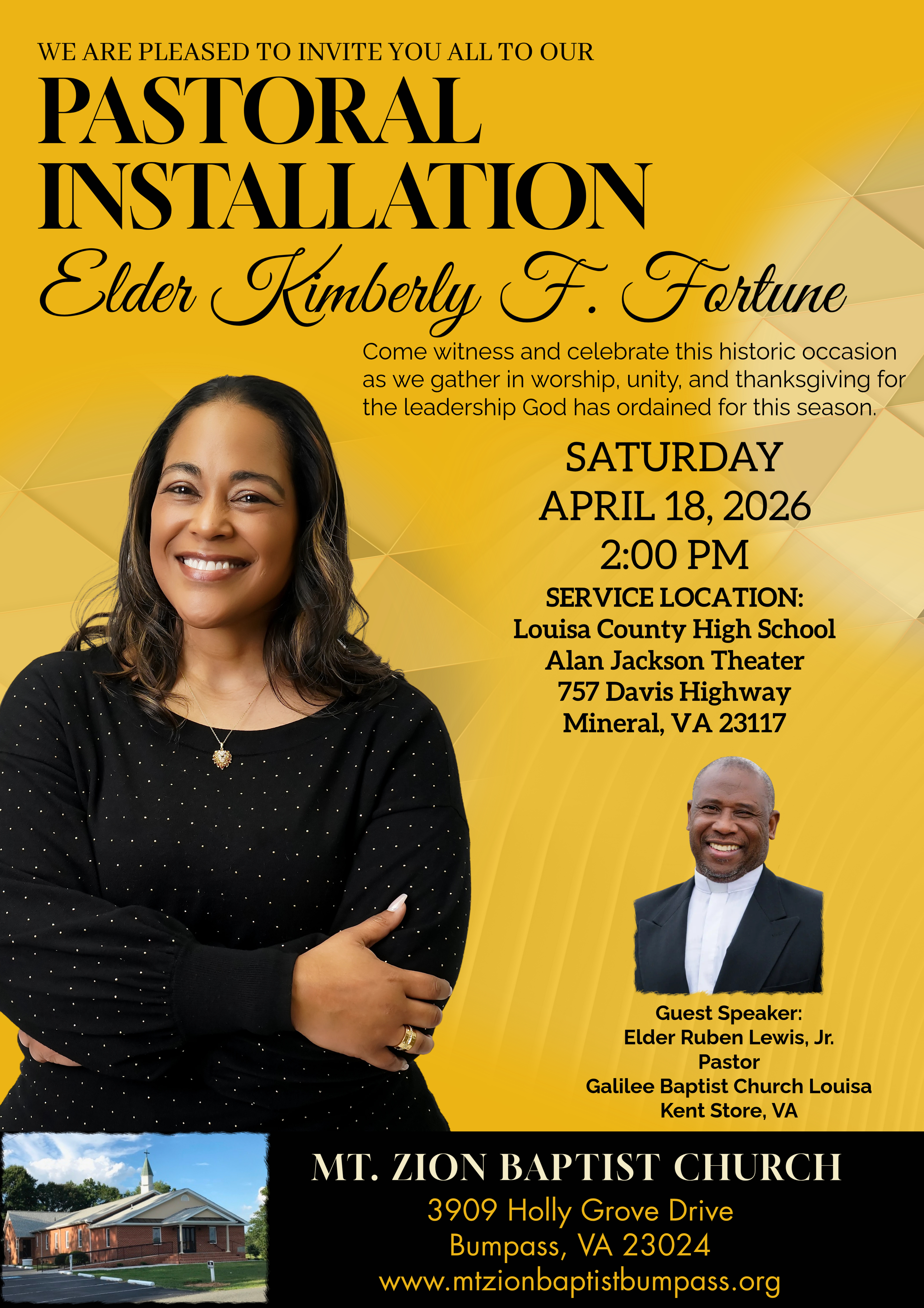We want to welcome our new pastor, Elder Kimberly Fortune. Pastor Fortune, having answered God’s call to shepherd His people with faith, wisdom, and compassion, will serve as the 11th Pastor of Mt. Zion Baptist Church in Bumpass, Virginia. Prior to this appointment, she served faithfully as an Associate Minister at Galilee Baptist Church Louisa in Kents Store, Virginia, under the leadership of Senior Pastor Elder Ruben Lewis, Jr. A lifelong member of Galilee, she was licensed on December 1, 2001, and ordained on October 6, 2007. Throughout her ministry journey, she has served in numerous capacities, including Sunday School and Bible Study teacher and Chair of the Ministerial Council. Pastor Fortune holds a dual degree in Sociology and Communications from James Madison University and an Executive Master of Business degree from Virginia Commonwealth University. She also serves professionally as the Employee and Organizational Strategy Operations Manager for the Virginia Department of Social Services. Raised in Louisa County by Deacon Emeritus Ashland and Sister Mary Fortune, Pastor Fortune treasures her family, which includes her sister, Dianna, and her nephew, Keith. Her ministry is deeply rooted in faith and obedience to God’s call, drawing inspiration from Isaiah 61:1—her life scripture and commissioning mandate—to comfort the disturbed and disturb the comfortable: